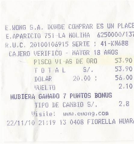 5. -"Pisco Viñas De Oro” Elaborado por Bodega Viñas De Oro. Botella de 750 ml. No. de Botella: 002730. Cantidad de Botellas Producidas: N.D. Lote No. N.D. Origen: Chincha-ICA. Cepa: Moscatel. Tipo de pisco: Puro. Cosecha: 2007. Medallas: N.D. Fecha de Vto: N.D. Grado Alcohólico: 41º Precio: S/.53.90.- Lugar de Compra: Wong.